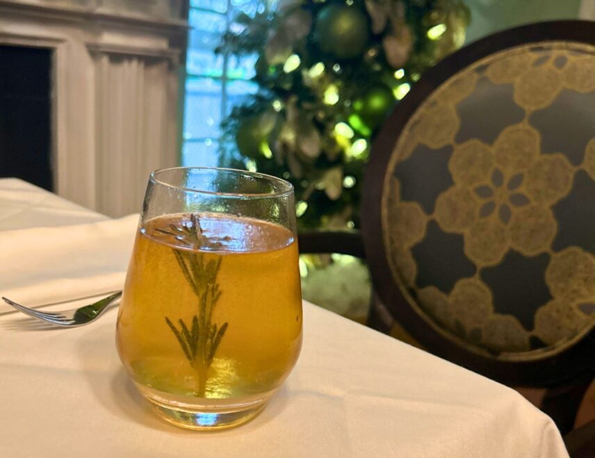 3. Freeze the glass until the water solidifies, creating a snow globe effect with the rosemary resembling a tree.